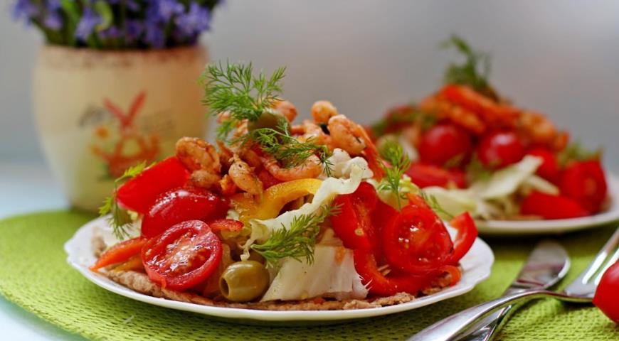 - En un plato extendimos una ensalada mixta de colina, cereza, búlgara pimientos, aceitunas y camarones. Vierta el aderezo resultante y servir