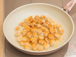 - Vierta el aceite vegetal en una sartén, caliente, ponga vieiras, freír de lado por dos minutos.