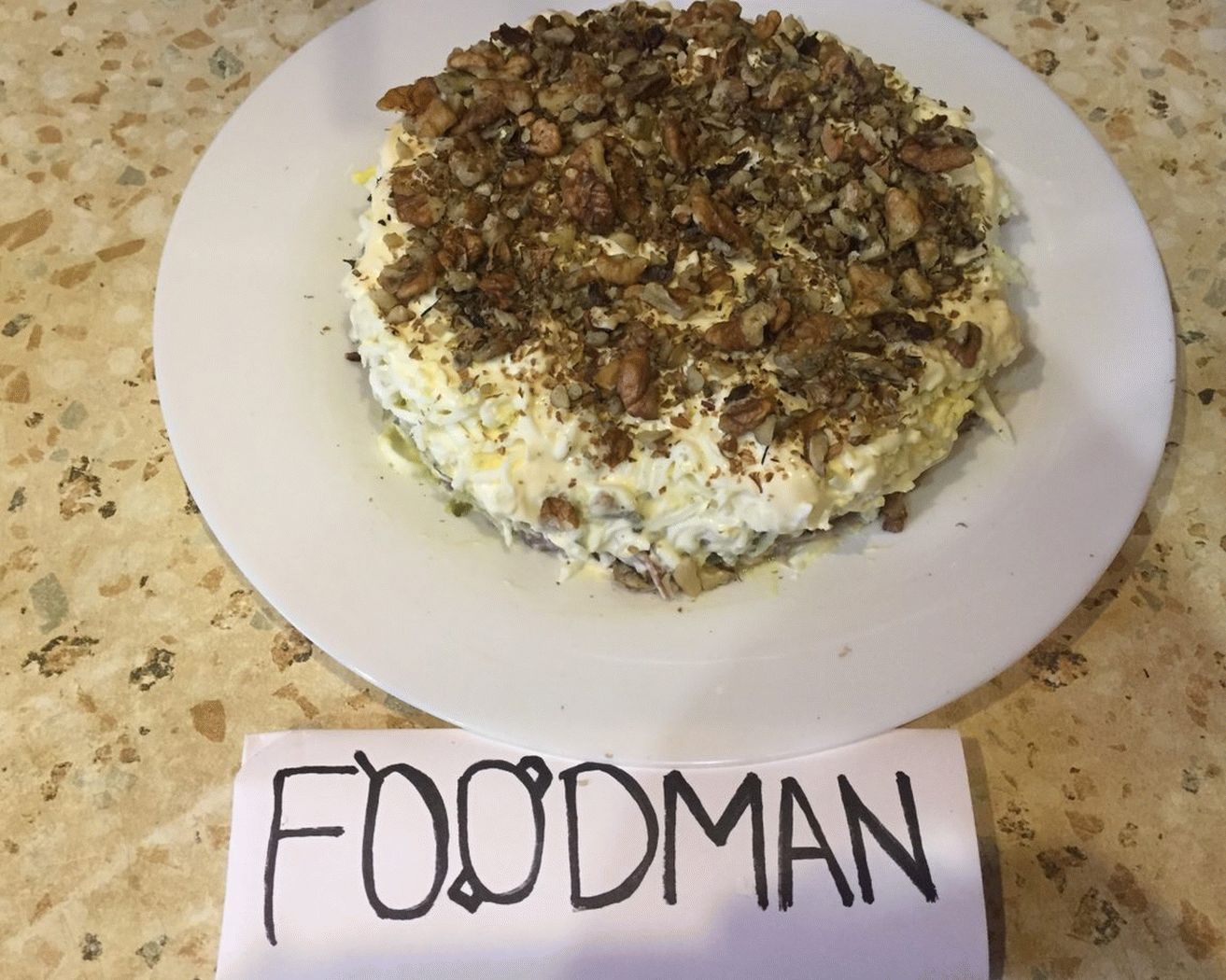 - Coloque la ensalada en capas: carne, mayonesa, pepinos + ajo, mayonesa, huevos, mayonesa, nueces (parte que corté finamente, finamente y parte dejada en pedazos).