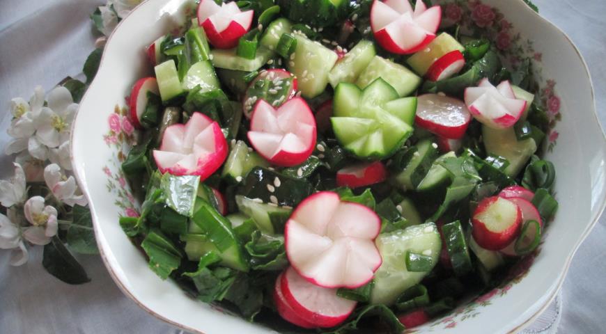 Una ensalada saludable y deliciosa de verduras frescas puede ser muy buena. cocinar rápido en casa Te aconsejo que hagas este plato con un maravilloso Una combinación de pepinos, rábanos y acedera agria para un refrigerio ligero.