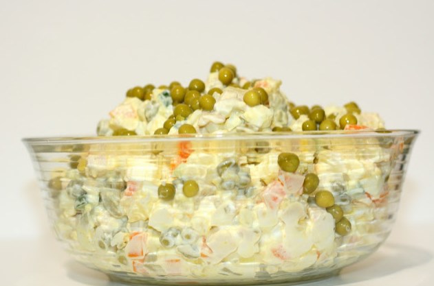 Enviamos crema agria a la ensalada preparada, mayonesa, bien mezclar, transferir a una ensaladera, espolvorear con conservas guisantes y servir en la mesa festiva.