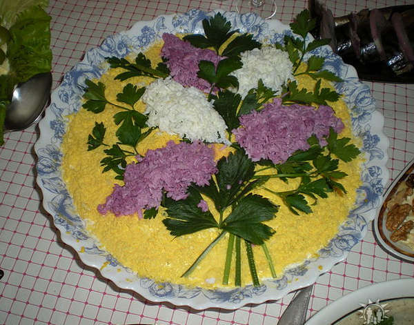 Deliciosa ensalada casera preparada con conservas de pescado. Hazlo en forma de un ramo de lilas: una presentación original para todos platos familiares