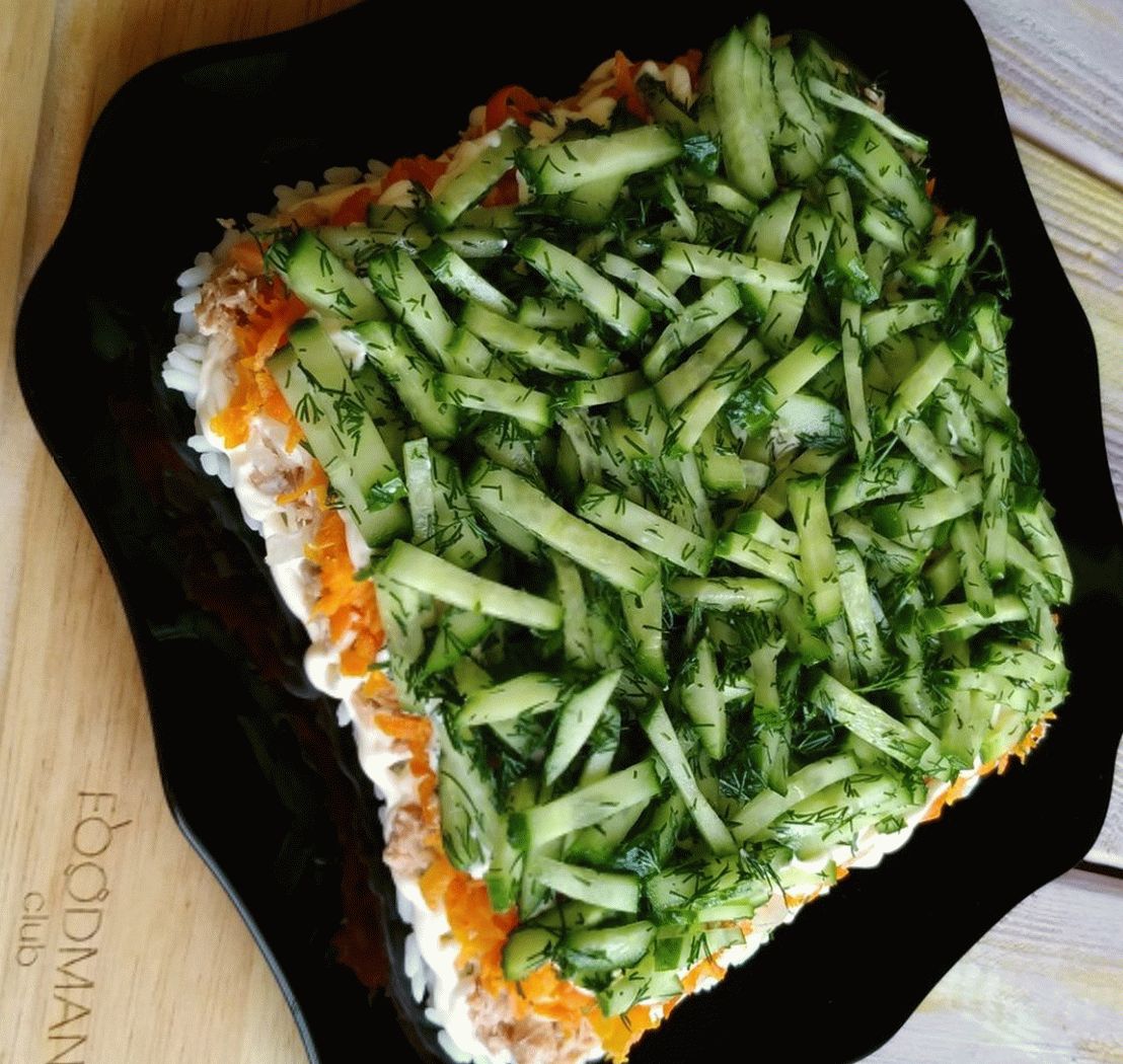 - Recoja la ensalada en capas: arroz – mayonesa – comida enlatada – mayonesa – cebolla – zanahorias – mayonesa – pepinos con eneldo.
