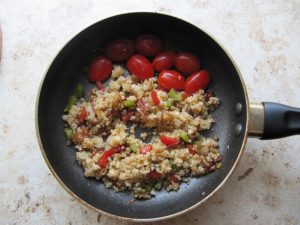 - Extendemos los tomates en una sartén con una rodaja hacia abajo, agregamos salsa de soya y cocine por unos minutos. Agregue cuscús a las verduras, mezclar todo, freír durante varios minutos.
