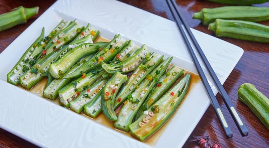 - Extienda la okra terminada en un plato, vierta con salsa de soja. Decorar con cebolla y pimiento.
