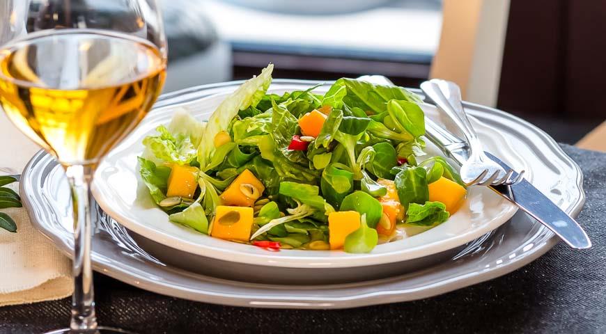 - Separe las hojas de estragón de las ramitas y mezcle con la ensalada. Sazone ligeramente y mezcle con la calabaza. Cambiamos a ensaladera, espolvoree con semillas y rodajas de ají.