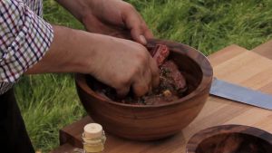 Pele la carne de las venas y retire la película, enjuague la carne y poner en un tazón a la marinada. Rallar el entrecot con esta mezcla y coloque el tazón en un lugar frío durante al menos 3 horas. Si hay La oportunidad es mejor toda la noche.