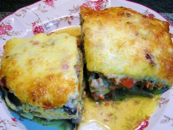 - Engrase una fuente para hornear con aceite. Diseñar capas: lasaña, salsa, berenjena. Lasaña de nuevo, salsa de berenjenas. Tercero engrase una capa de lasaña con salsa.