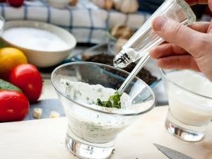 - Para la salsa, picar las hojas de menta, mezclar con yogur, agregar unas gotas de jugo de limón, sal y pimienta al gusto.