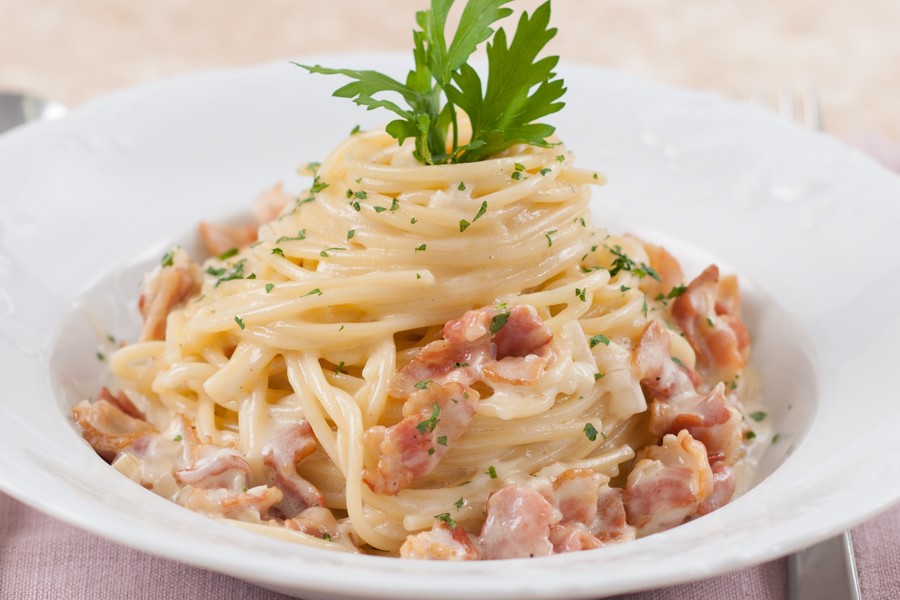 La carbonara clásica es la receta de todos los tiempos. Cocinar en casa espagueti con tocino y deliciosa salsa de queso que podría ser es mejor?