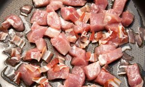 Cortar el filete de cerdo en trozos pequeños, el tocino en tiras y poner en aceite caliente. Freír a fuego alto hasta las piezas no se doran y se ponen en un plato.