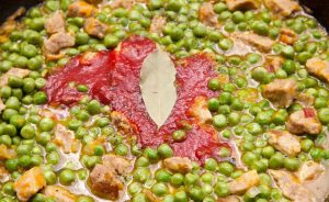 Estofado fragante ya preparado con guisantes verdes servido con su amado decorar y una ensalada ligera de vegetales.
