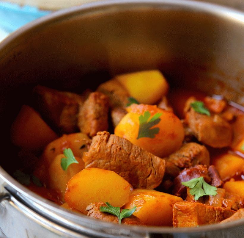 Fragante estofado de cerdo con papas y chorizo ahumado servido con pan fresco, encurtidos y tomates.