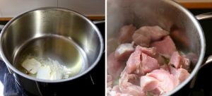 Carne de cerdo cortada en trozos pequeños, untada en mantequilla derretida y freír hasta que se dore, en promedio el fuego Picar la cebolla con ajo finamente, papas peladas – grandes rodajas, chorizo ahumado – círculos.