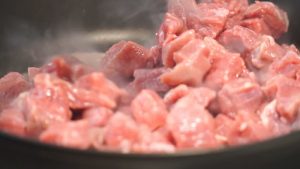 Filete de cerdo cortado en trozos pequeños y enviado a aceite caliente, freír a fuego alto durante 5-7 minutos, hasta ponte rojo.