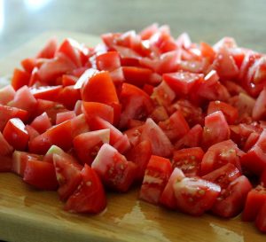 Cebollas peladas finamente picadas, tomates con cáscara – en medio piezas