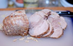 Lave el filete de lomo de cerdo o los omóplatos, séquelos con papel con toallas y para dar forma, poner en una rejilla para carne o atar con una cuerda culinaria. Cortar los dientes de ajo en varias partes, perforar la carne con un cuchillo e insertar en los cortes.