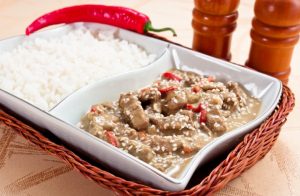 La carne es deliciosa, suave y aromática. Decora esto El arroz hervido de grano redondo es ideal para el plato. Yo recomiendo cocina la carne para la cena o el almuerzo en casa de acuerdo con esta receta.