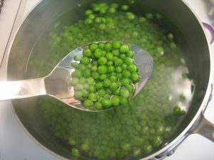- Los guisantes verdes blanquean literalmente un minuto. Vaciar el agua enfríe los guisantes en agua helada para mantener el color.
