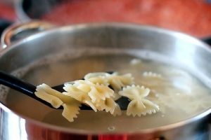 - Hervir farfalle de acuerdo con las instrucciones del paquete. Vaciar el agua dejando unas cucharas para la salsa.