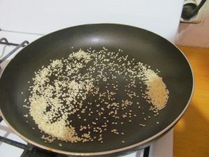 - Vierta las semillas de sésamo en una sartén caliente y ligeramente alevines