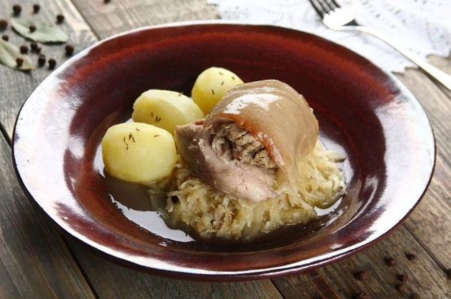 Las patas de cerdo se cocinan en casa de muchas maneras: se cocinan, hornee al horno, complementado con hierbas aromáticas y ajo. Intente hacer un delicioso plato nuevo de pierna de cerdo hervida y Chucrut estofado. Servir hervido para tal plato. o papas al horno.