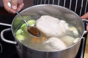 Lave bien las piernas de cerdo, coloque una llena la sartén con agua para cubrir completamente la carne de cerdo, agregue la cebolla picada (1 pc), zanahorias, pimienta molida, sal y cocine después de hervir a fuego lento durante 2 horas. Opcionalmente en cambio sal, puedes agregar caldo de carne (1 pc).