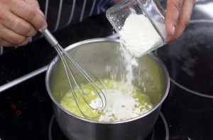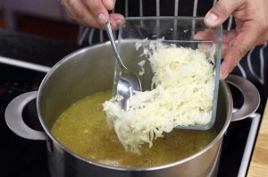 Derretir la mantequilla, freírla picada cebollas (1 pc.) hasta que estén blandas, vierta la harina, alterne y agregue la mezcla al repollo guisado.