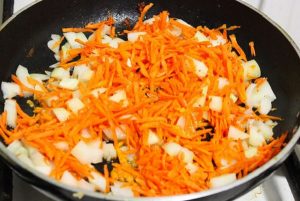 - Pique las zanahorias en tiras y corte las cebollas en pequeñas. cortado en cubitos y freír en una sartén con aceite vegetal.