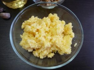 - Hervir las gachas de maíz (relación cereal / agua 1 a 3). Vierta los granos en agua hirviendo en una corriente delgada, revolviendo ocasionalmente. Cocinar unos 30 minutos a fuego lento.