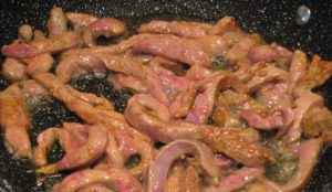 - Caliente el aceite de oliva en una sartén, mezcle el hígado, freír al fuego ligeramente por encima del promedio, freír hasta que estén doradas.