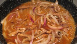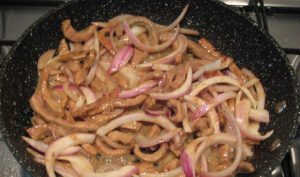 - Vierte la cebolla al hígado, fríe, revolviendo durante cinco minutos.