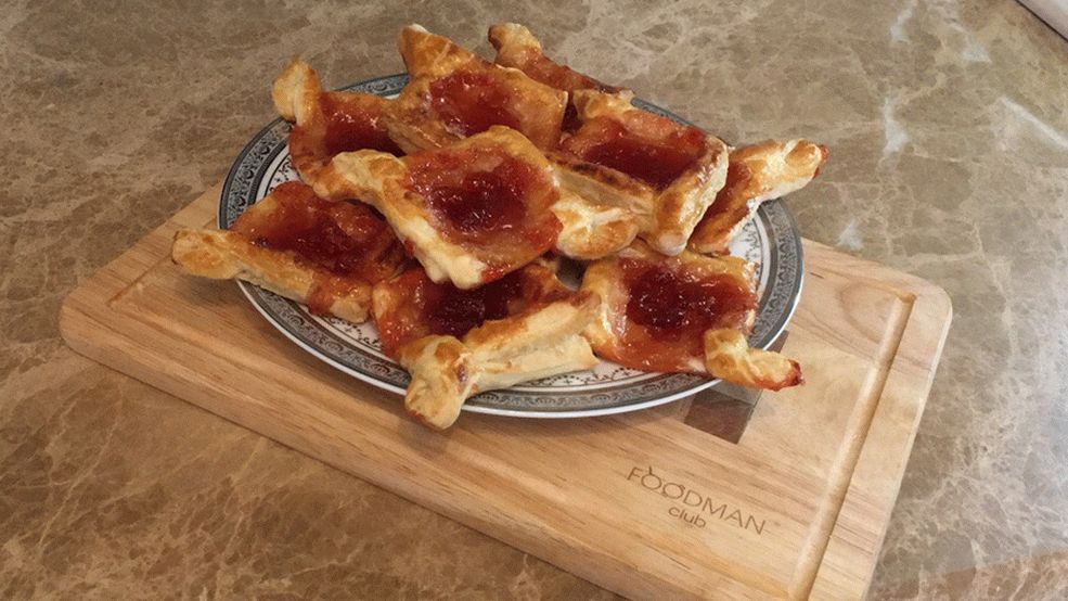 - Estirar hojaldre, cortar cuadrados, hacer cortes (como se muestra en el video), fije los bordes.
