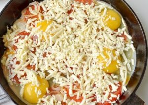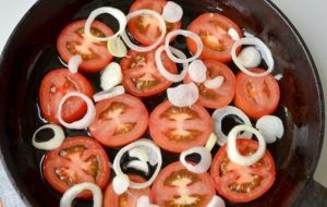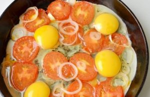 - Cebolla con tomates cortados en círculos. Calentamos la sartén con mantequilla, untar cebollas y tomates.