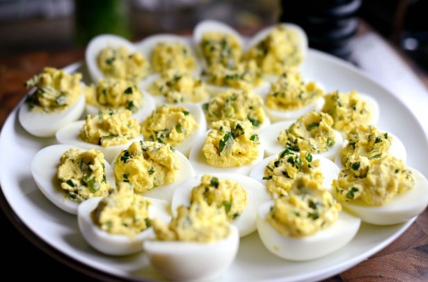 Un bocadillo hermoso y sabroso en la mesa festiva resultará si hacer huevos rellenos caseros con queso crema, mayonesa, perejil y cebollino.
