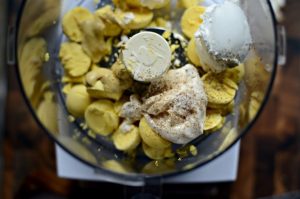 Agregue queso crema, mayonesa, jugo de limón, molido a las yemas. pimienta, sal y mezclar.