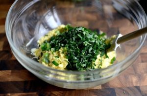 Envió la mezcla preparada en un tazón, agregue finamente perejil picado, cebollino y mezcla.