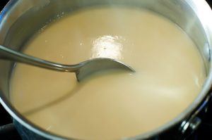 - Derrita la mantequilla en una cacerola. Revolviendo constantemente agregue harina y vierta la leche. Agrega especias. En un pequeño fuego cocina hasta que la salsa se espese. Vierta la mitad del queso rallado. Revuelva bien. Retirar del fuego.
