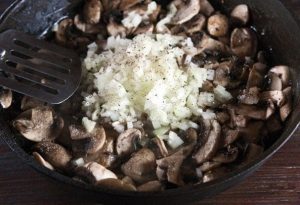 - Pica finamente la cebolla y agrégala a los champiñones. Guisar por otros 7 minutos.