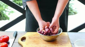 - Lleve el ghee a temperatura ambiente. De carne eliminar todas las venas y películas. Cortar en trozos de 3,5-4 cm de tamaño.