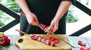 - Llevamos los carbones al estado deseado, deberían arder bien. Cortar el pimiento en trozos idénticos (3 cm). Nos ensartamos en brochetas carne y pimienta, alternando.