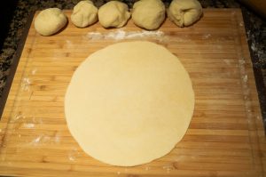 Divide la masa en 4 partes. Enrolle cada una de ellas finamente y con usando un rodillo, transfiéralo a un lugar precalentado a la sartén.