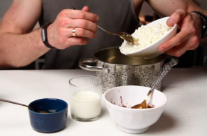- Retira la gelatina de la estufa. Introduce todos los ingredientes en un tazón. En gelatina agregue requesón, agregue leche, agregue cacao en polvo y cariño