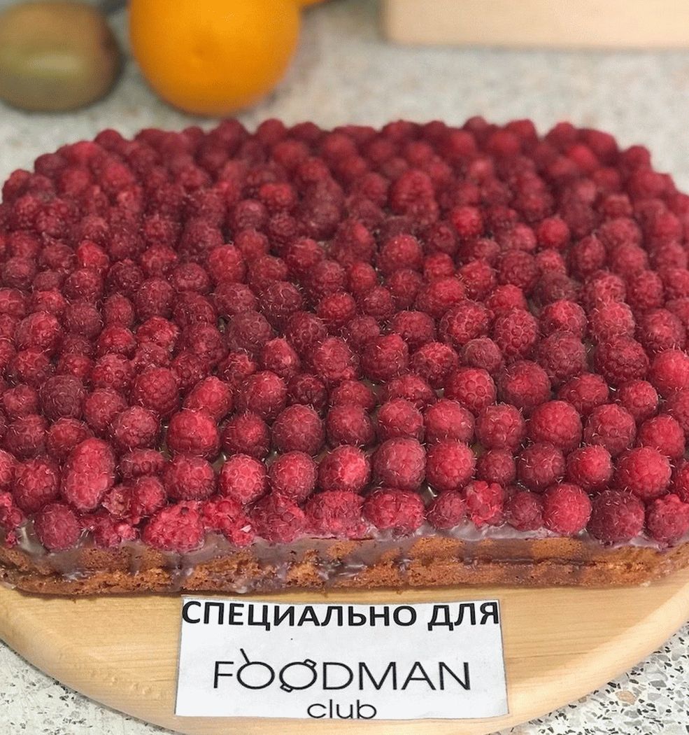 - En forma caliente, vierta el pastel encima e inmediatamente extiéndalo frambuesas en toda la superficie.