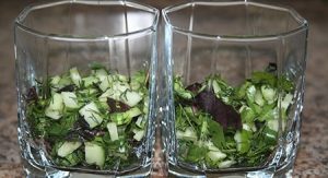 - Tal okroshka se puede servir en vasos. Extendido en ellos pepinos con hierbas, agregue una pizca de sal.