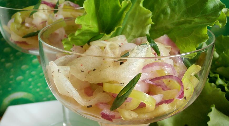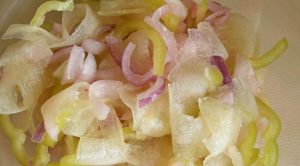 - Limpiamos el pimiento verde del tallo, las semillas y las particiones. Cortar en medias anillas. Mezcle suavemente el pimiento, la cebolla y las cintas. melones Probamos con sal, agregamos más, si es necesario.
