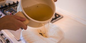 Colar el caldo de pollo. Es mejor hacerlo con una gasa, doblado por la mitad varias veces. Calienta el líquido y disuelva la gelatina en ella. Revuelva bien y retire de fuego