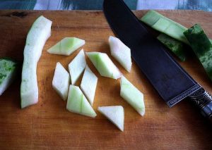 - Pelar las cáscaras de sandía de la cáscara espesa verde y el resto Partículas de pulpa rosa. Luego corta las cáscaras, puedes mostrar fantasía y corte en cualquier forma que se te ocurra.