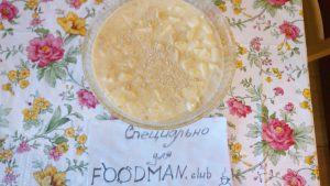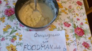 - Pelar las manzanas, cortarlas en trozos, agregar a la masa y mezclar Lubrique la forma con mantequilla. Poner la masa en forma