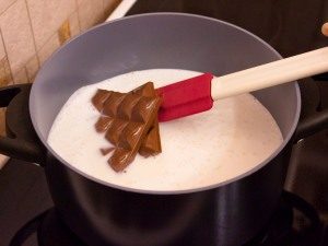 - Hervir la leche, agregar el chocolate, revolver hasta completar disolución